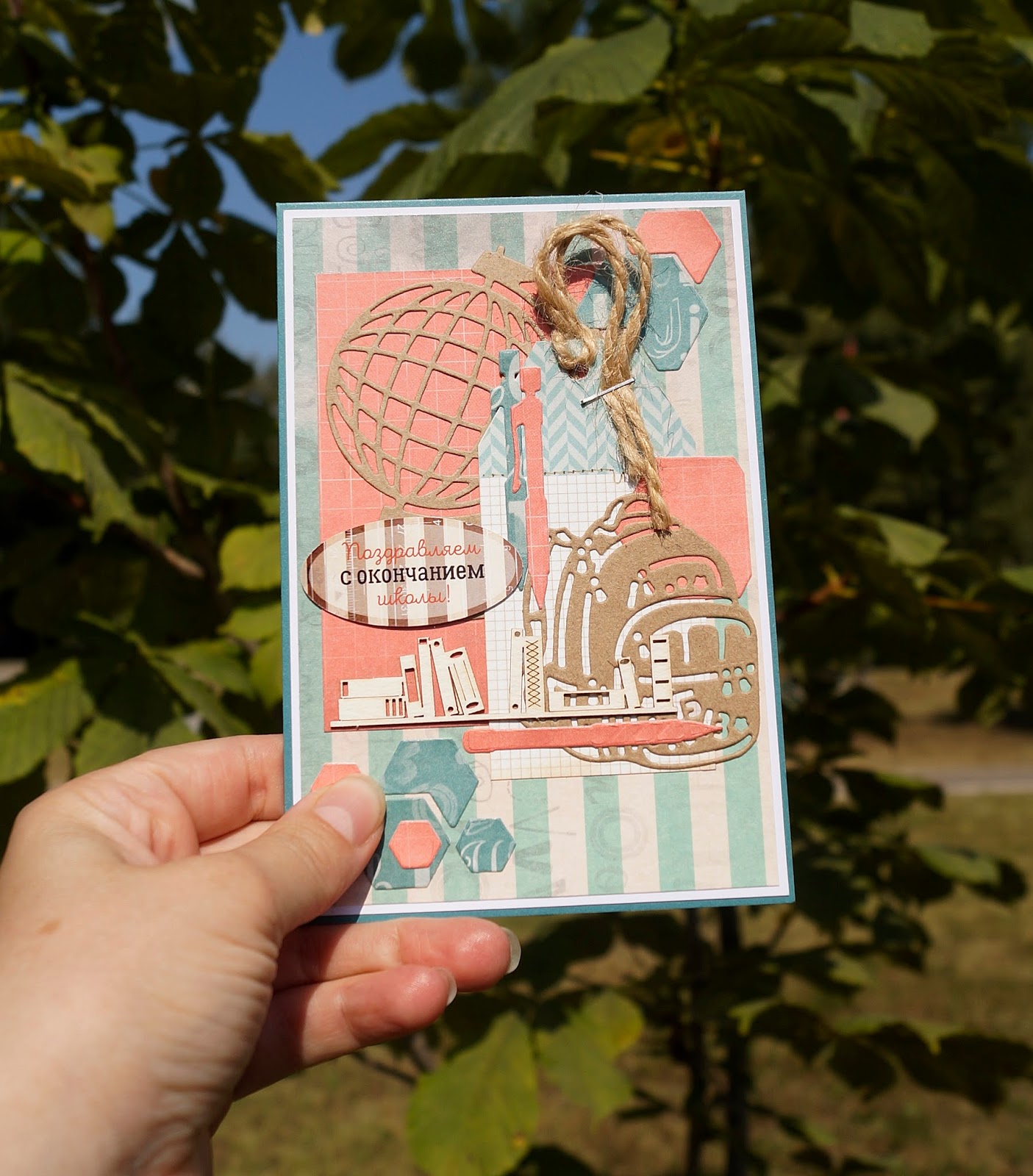 А на этом фото - альбом и ...открытка, которую я переименовала, т.к., бумаги был всего один набор, на другую открытку не хватило, а очень хочется поздравить сына с окончанием школы. Тем более, что и надпись подходящая нашлась в наборе высечек.)))