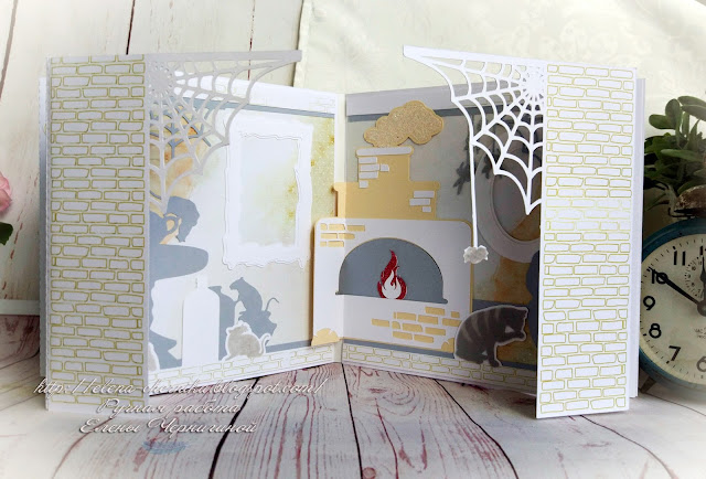 Обязательным элементом у нас идет фигурная страничка или вставка в нее. У меня открывающиеся фигурные створки в виде кирпичной стены, поросшей паутиной. А еще фигурным элементом на моем развороте является печка. Мне не хотелось делать ее в виде элемента Pop-up, поэтому краешек ее складывается пр закрытии.