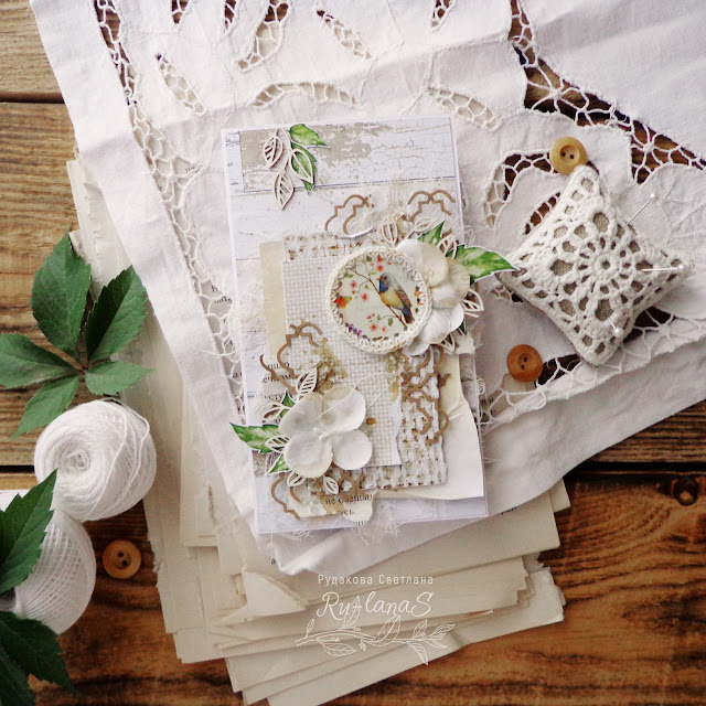 Кроме степей, в памяти прочно установилась связь между деревушкой и тутовником. Этой мой вкус детства. Помню, как ребенком лазила по деревьям, ела тутовник, вся чумазая, но счастливая! Открыточку постаралась сделать деревенской, простой и теплой. Листочки послужили как заросли тутовника, коричневый чип - как будто заборчик полуразрушенного дома, за которым скрывается вожделенный сад. Ну и конечно птицы... вместе лакомились любимой ягодой)) Палитру выбрала светлую, принты натуральные.. немного марли, книжных страничек и тонированных листов. Не удержалась, добавила цветов, а бисер как капельки дождя... Он стеклянный, но серединка крашенная. Немного капелек крепкого кофе... мммм...