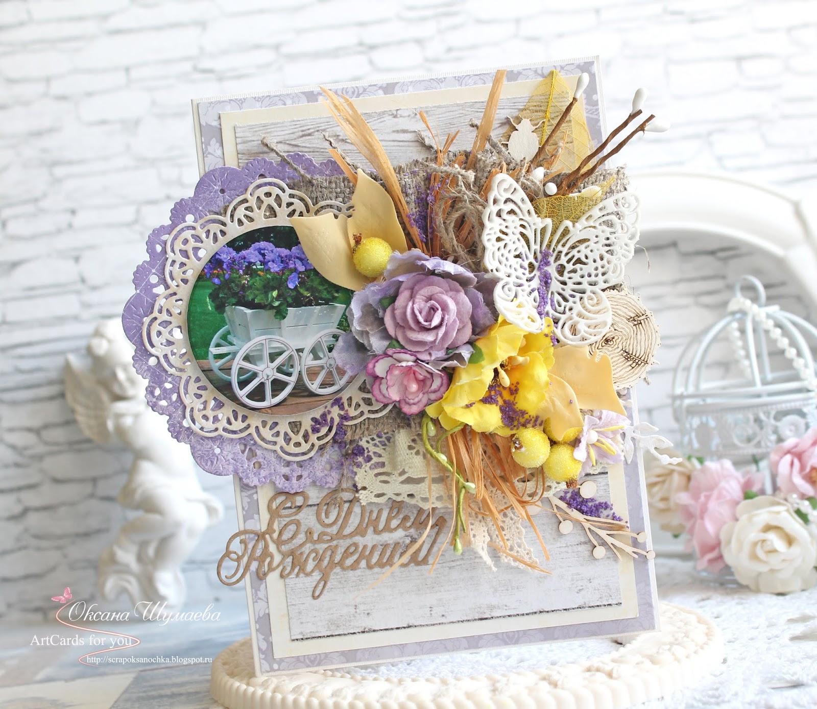 В моем понимании ЛЕТО - это много СОЛНЦА. Наверное, потому, что я прожила половину своей жизни на Юге нашей огромной страны. А сейчас живя в Сибири, мне не достает этого тепла и света. Я просто обожаю желтый цвет в работах. Это главная ассоциация с летом. Но преимуществом сибирского региона является буйство красок в летний период, потому, что все растения стремительно распускаются, т.к. лето очень короткое и каждое из них "хочет" успеть показать себя во всей красоте. Я постаралась максимально отразить мое лето в открытке, показать всю сочность нашего региона. Проезжая поля как раз можно увидеть вот это сочетание фиолетового и желтого...Это непередаваемая красота. Именно луговые цветы вдохновили меня на данную работу.