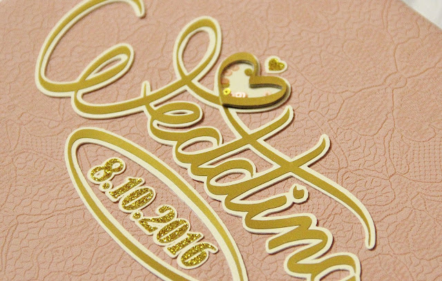 Кожзам персиково-розового цвета с эффектом кружева и двухслойная надпись из светлого кожзама и золотой фольги.