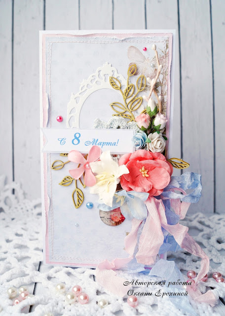 Стоит заметить, что я придерживаюсь такого мнения, что независимо от того, какую должность занимает женщина, она всегда остается женщиной и она любит различне приятности, букетики и подарочки. Поэтому я стараюсь максимально отразить женственность открытки, а уже второстепенно какие-то профессиональные моменты.